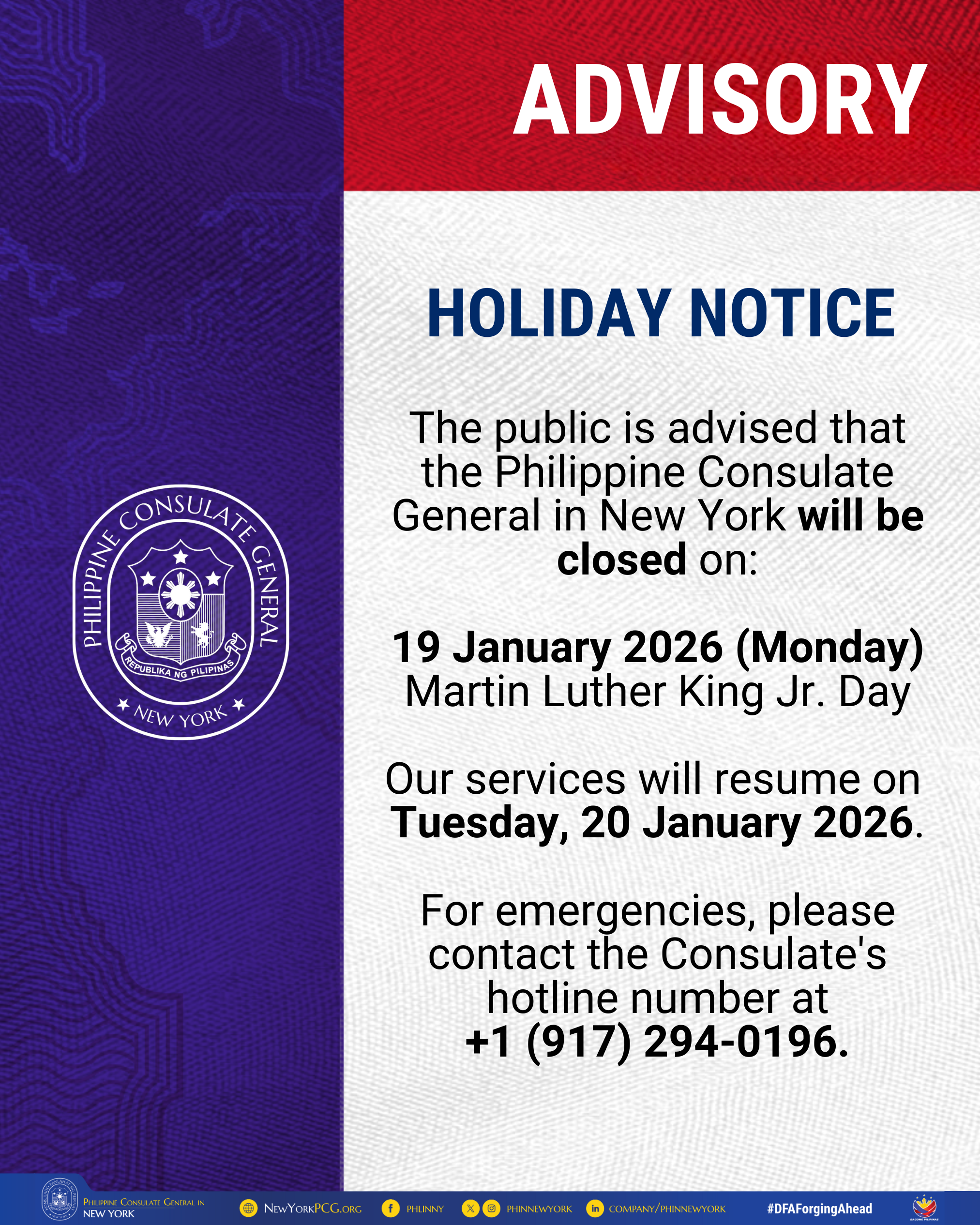 Post published:5 January 2026 Post category:Advisories / Announcement & Advisories / Announcements / News and Events Reading time:1 min(s) read Holiday Notice, January 2026 Read more articles Previous PostNew Year’s Message from the Consul General, January 2026Next PostPhilippine Consulate General in New York Marks 4th Anniversary of Sentro Rizal with Visit from Rizal Descendant You Might Also Like 26th Paaralan sa Konsulado 23 May 2024 Winter Storm Warning 18 January 2019 [Registration for Partners] Simbang Gabi sa Konsulado 2024 18 September 2024 Public Advisory: Change in Ballot Feeding Schedule for 21 April 21 April 2022