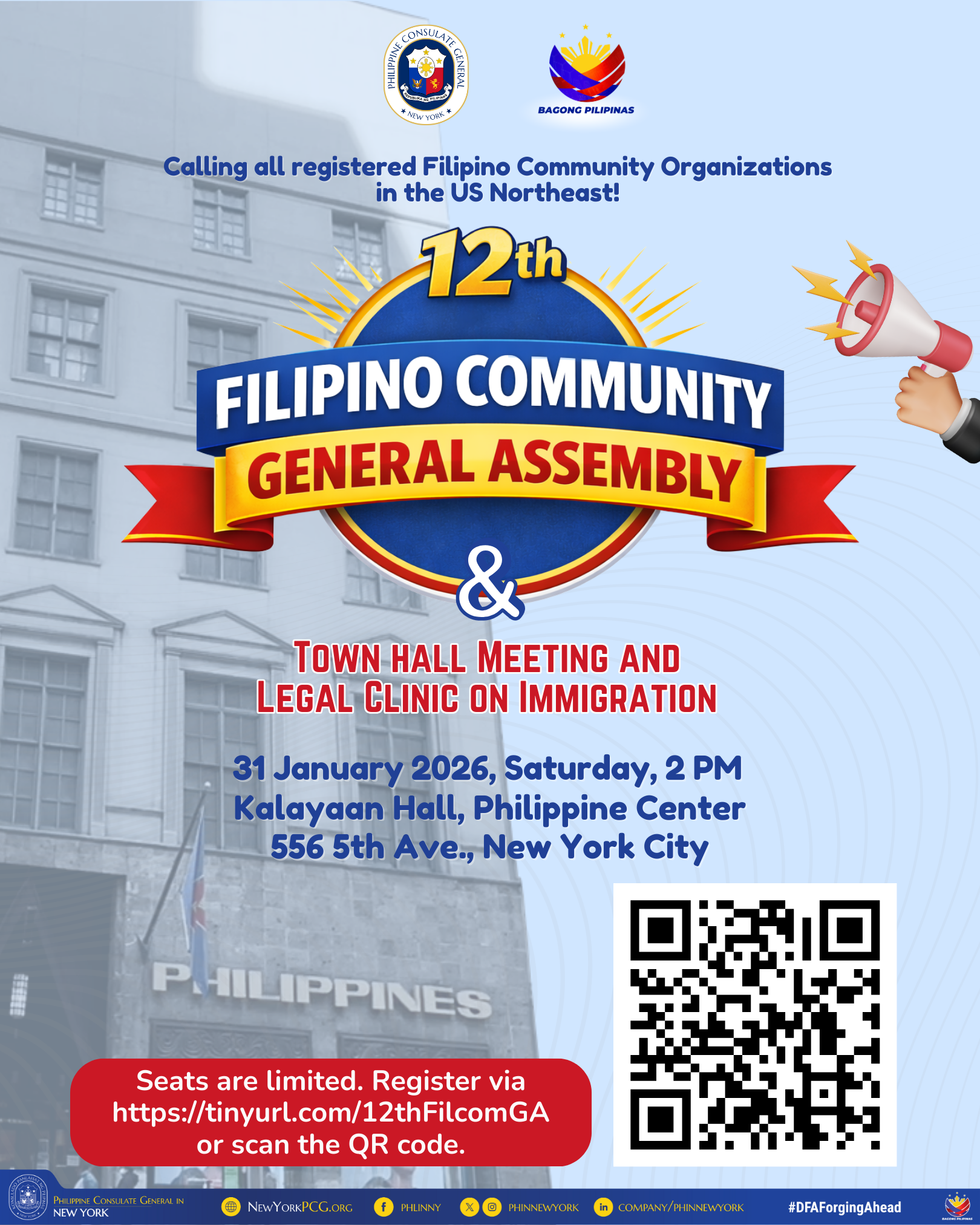 The Philippine Consulate General in New York invites all registered Filipino community organizations in the US Northeast to the 12th Filipino Community General Assembly. Be part of this important gathering and stay informed about the latest accomplishments, upcoming projects, and events of the Philippine Consulate.