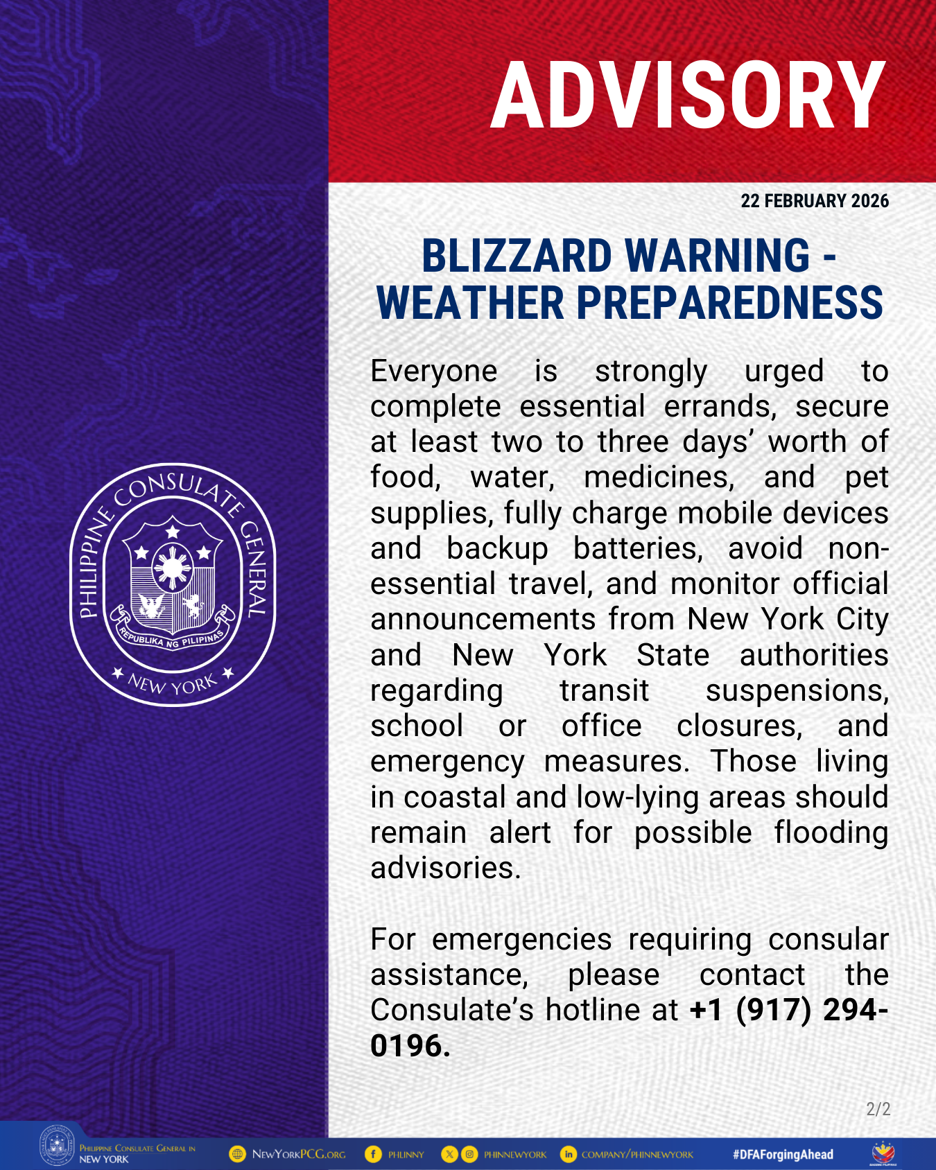 Following the declaration of a State of Emergency by New York Governor Kathy Hochul in anticipation of severe winter weather conditions, Filipino communities in the US Northeast are advised to undertake all necessary preparations and heed the warnings of local officials as a Blizzard Warning remains in effect for New York City, Long Island, and the broader Tri-State area from today, 22 February 2026 until 6:00 PM, Monday, 23 February 2026.