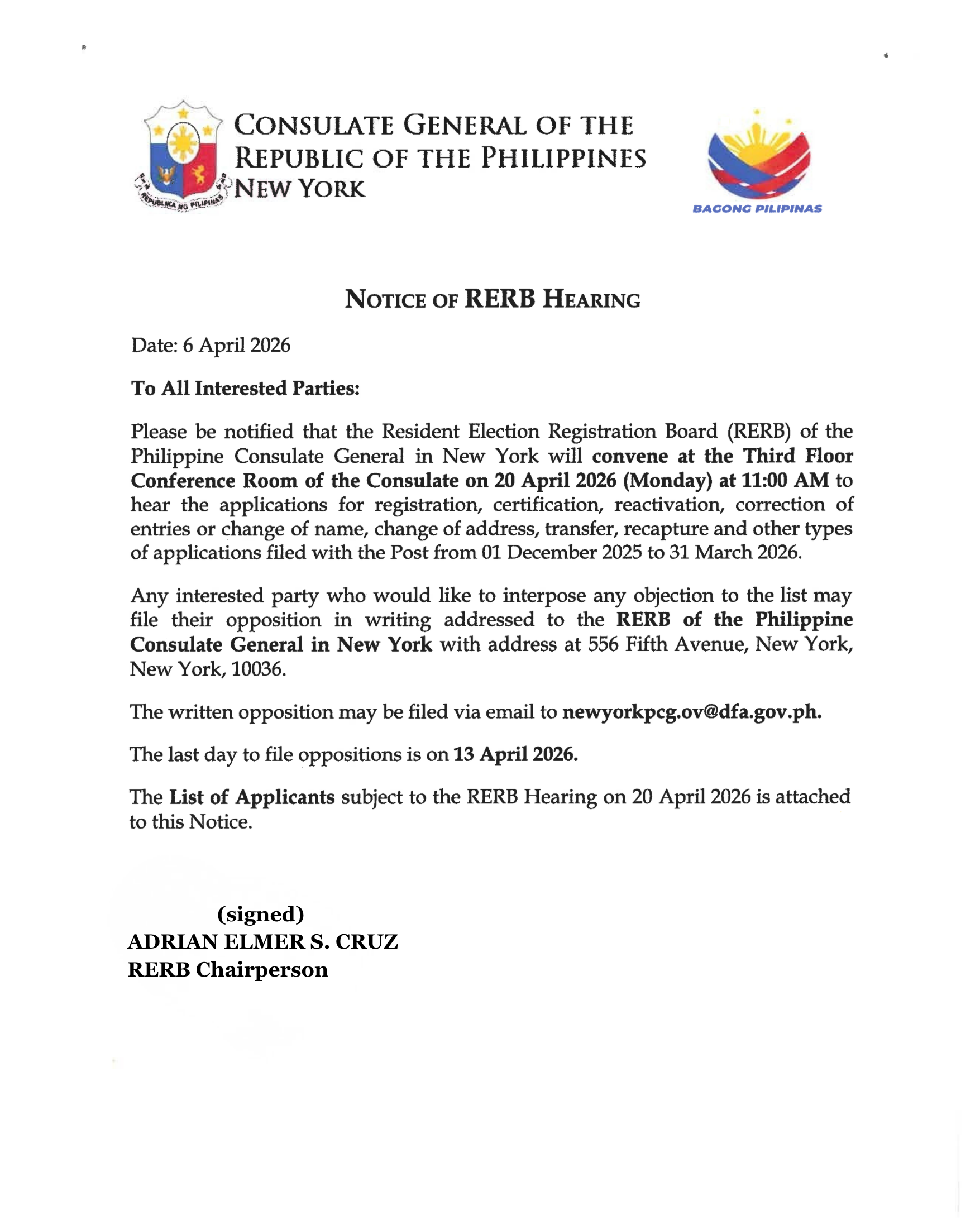 Post published:13 April 2026 Post category:Advisories / Announcement & Advisories / Announcements / News and Events Reading time:1 min(s) read Notice of Resident Election Registration Board (RERB) Meeting, 20 April 2026 The List of Applicants subject to the RERB Hearing on 20 April may be accessed at this link: https://tinyurl.com/8p7apbsz Read more articles Previous PostPhilippine Consulate General in New York Honors Filipino Bravery and WWII Heroes at 84th Day of Valor CommemorationNext Post“Eight Decades Of Harmony”: Philippine Consulate General, New York City Opera, and Manhattan School of Music Celebrate 80 Years of PH-US Relations in Landmark Concert You Might Also Like PH Consulate General In New York Holds Media Hour with COMELEC on 2025 Online Voting System 1 April 2025 [Infographic] Kabayan, may karapatan ka! 21 January 2025 Advisory No. 26: Visa Requirements for Foreign Spouses / Children / Parents of Philippine Citizens 6 August 2020 Fintech Literacy Launched at Philippine Consulate 14 January 2023