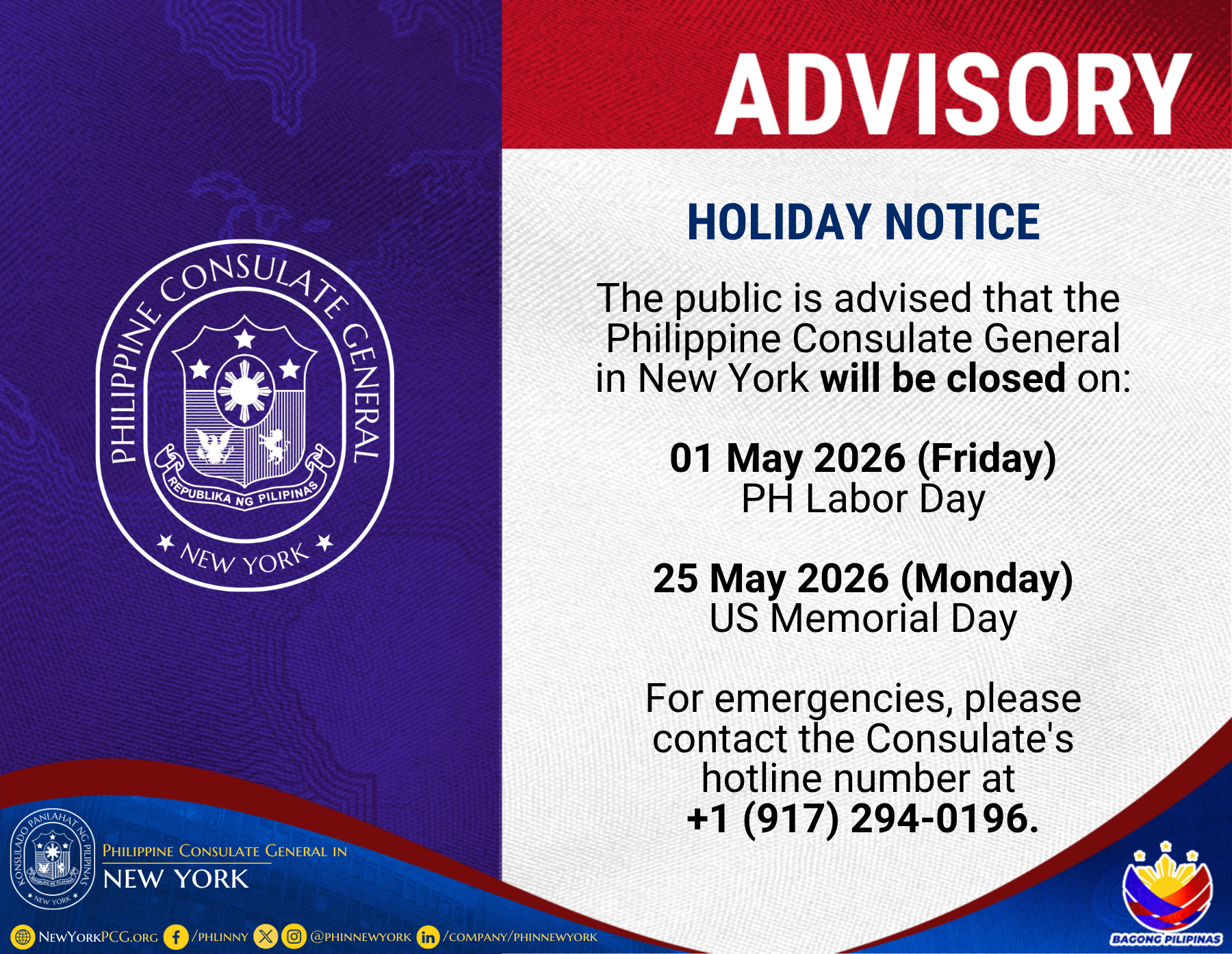 Post published:21 April 2026 Post category:Advisories / Announcement & Advisories / Announcements / News and Events Reading time:1 min(s) read Holiday Notice, May 2026 Read more articles Previous PostNew York PCG Marks Immigrant Heritage Week with Historic Walk-About in “Little Manila” Neighborhood You Might Also Like Weave Your Way: Traditions of Philippine Textiles 5 February 2025 Holiday Notice, November 2024 25 October 2024 Public Advisory: Ballot Feeding Schedule for the Final Weekend 4 May 2022 80 Years of Valor: Honoring the Heroes of the Liberation of Manila 13 March 2025